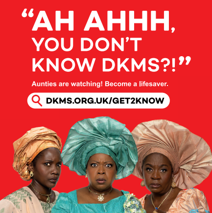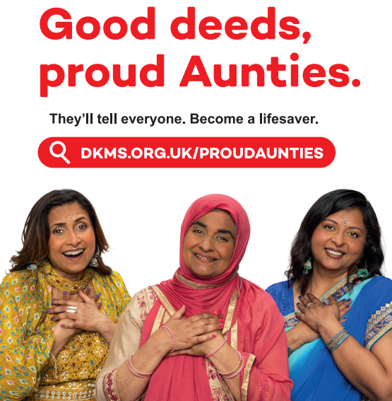 DKMS UK has launched a new advertising campaign across London, Birmingham and Leicester, which focuses on raising awareness of the stem cell donor register in these cities’ Black and South Asian communities. The ads, which can be seen on billboards, buses, and bus stops, encourage us to find out more about DKMS, and join the stem cell register. They feature the DKMS ‘Aunties’ telling us to get to know DKMS, and calling on us to make our Aunties ‘dance with joy’.